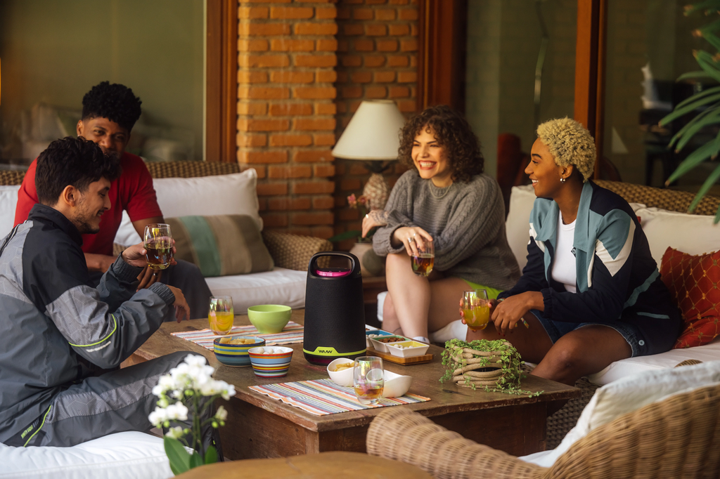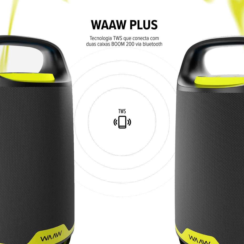 – O WAAW PLUS permite que a tecnologia TWS conecte até duas caixas BOOM 200 via Bluethooth.
