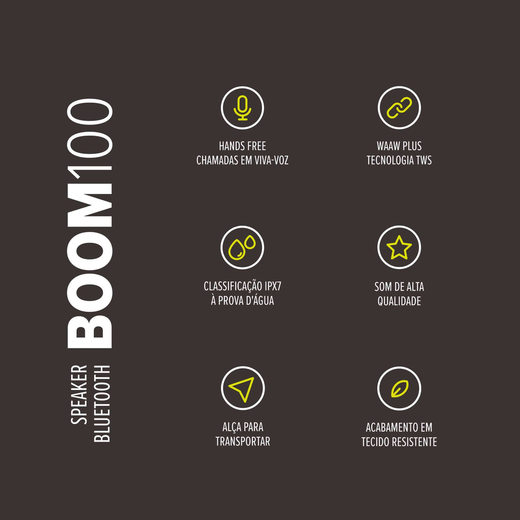 Com seu som claro e nítido e recursos avançados, a caixa de som WAAW BOOM 100SB é a caixa de som perfeita para suas necessidades de áudio, seja em casa ou em movimento. Não perca a oportunidade de melhorar sua experiência de áudio hoje mesmo!