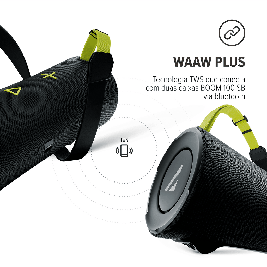 E com a tecnologia TWS, você pode conectar duas caixas de som WAAW BOOM 100SB para uma experiência de som surround.